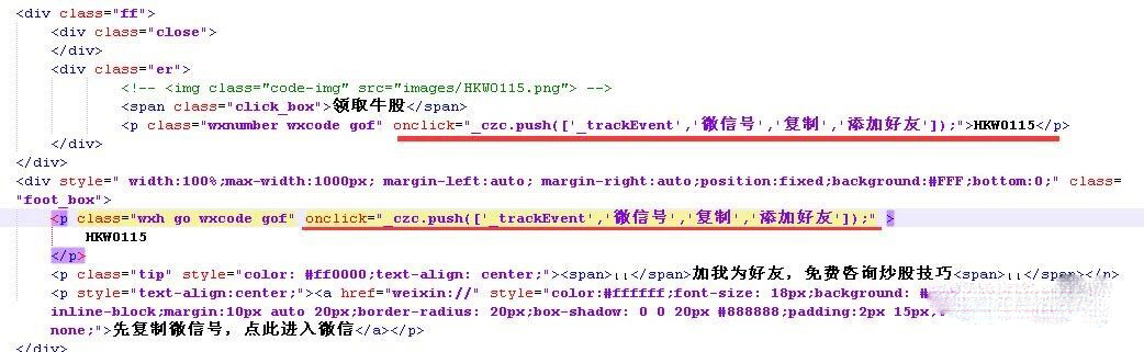 這個是事件轉化的代碼,而我們埋點的時候,還要加上js的函數,這里使用onclick函數來設置:onclick="_czc.push(['_trackEvent','微信','復制','添加好友']);"