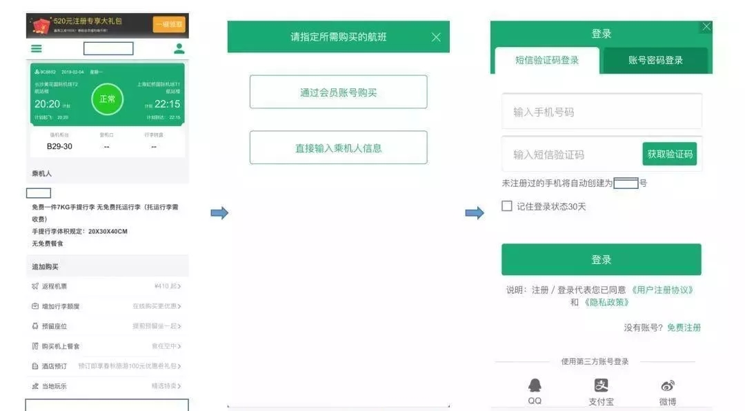 例如:某航司的短信鏈接落地頁,當你預訂好機票以后,會收到已出票提示短信,可以在落地頁中看到自己的航班信息,并且可以選擇追加增值服務產品,比如購買行李額或餐食。當你想選購增值服務前,需要經歷兩步驗證信息。如果說系統能識別打開短鏈設備手機號為預訂人手機號,就可以減少此兩步操作。