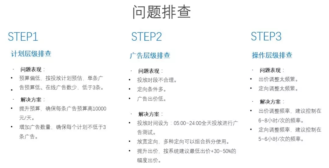 需要注意的是在數據分析的過程中,發現問題,對問題進行排查的過程中, 建議從三個層級入手:計劃層級排查、廣告層級排查、操作層級排查。示例如下