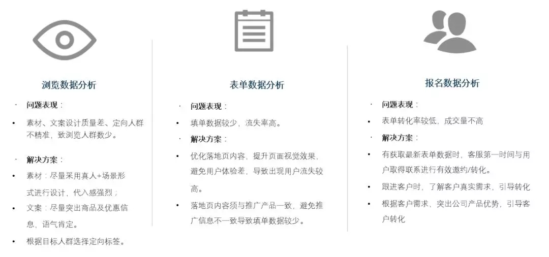 這個時候還需要通過投放過程中的關鍵數據進行分析,比如落地頁瀏覽數據一般,可以從素材、文案、人群定向等方面去考慮和優化,根據不同的場景、人群,采用相對應的素材、文案,同時優化目標人群定向標簽。