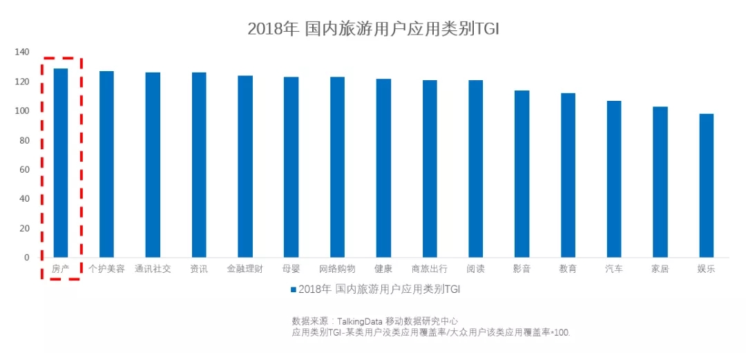 據TalkingData2018年數據顯示,除娛樂應用外,國內旅游用戶對移動應用的偏好度均高于大眾用戶,其中,國內旅游用戶對房產、個護美容、通訊社交、咨詢和金融理財類應用的偏好度較高。