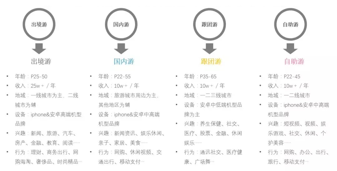 根據用戶需求的不同,將在線旅游行業主要分為4大類人群:出境游、國內游、跟團游、自助游。