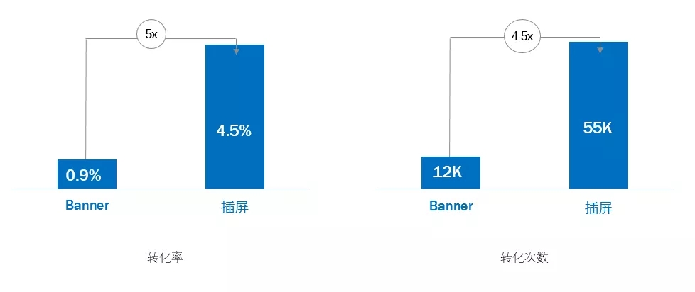 Banner/插屏也是曝光目標人群最廣泛的廣告形式。相比Banner,插屏的轉化率要高出5倍,轉化次數高出4.5倍左右。