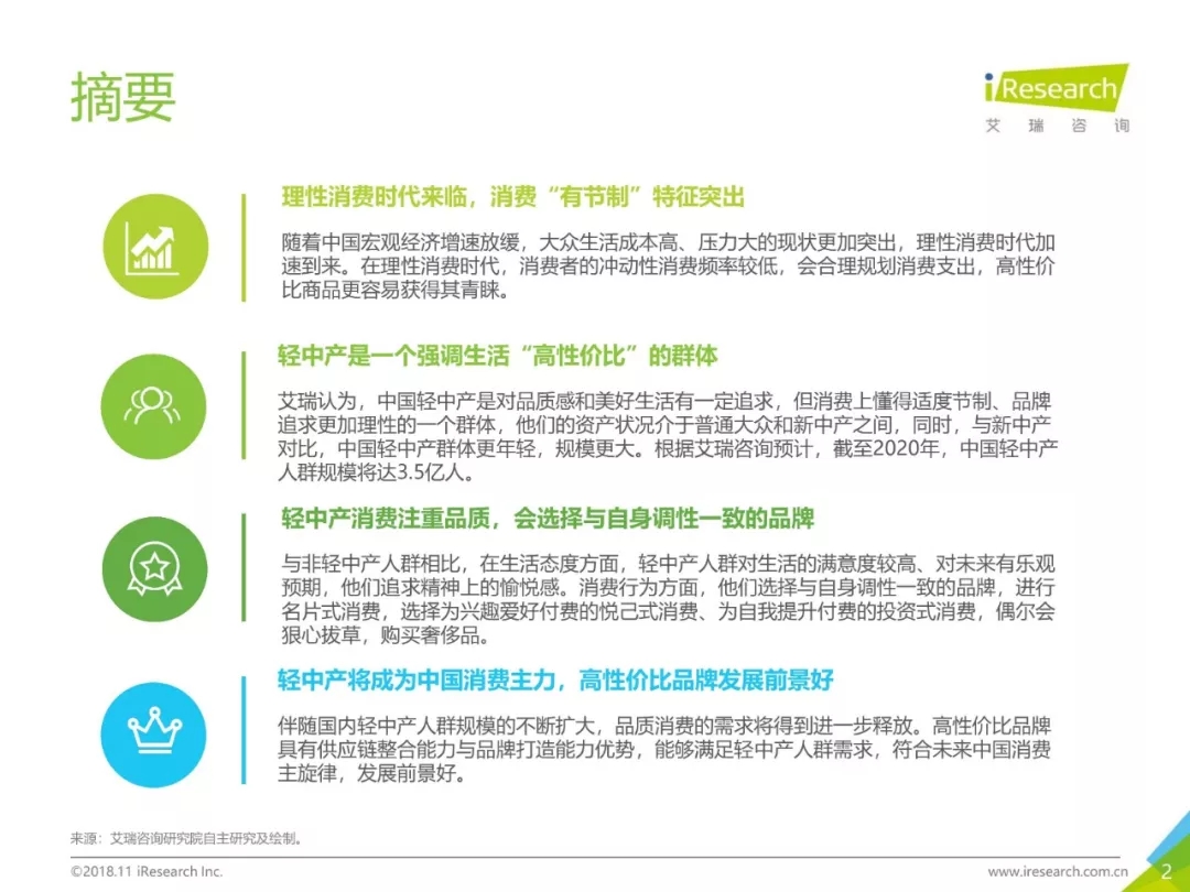 ? 《中國輕中產人群研究報告》介紹了中國輕中產群體出現的社會經濟背景,并描繪出輕中產人群畫像。同時,結合調研數據,本報告分析了中國輕中產群體的五大生活態度、五大消費特征。最后,報告對中國未來消費趨勢進行了展望。