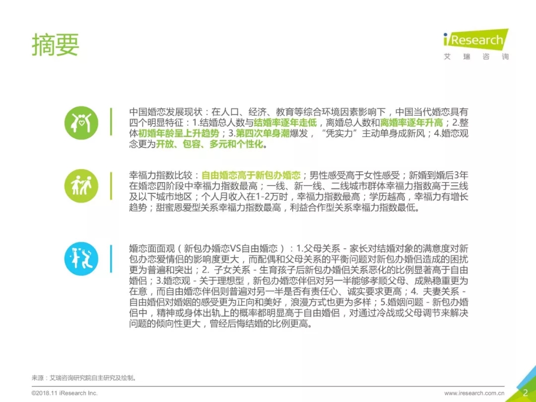 ? 《中國婚戀幸福力指數研究報告》通過定量調研,探究處在四個不同階段(戀愛中、婚后1-3年、婚后4-7年以及婚后7年以上)婚戀的幸福程度以及“新包辦婚姻”對婚姻家庭關系的影響。