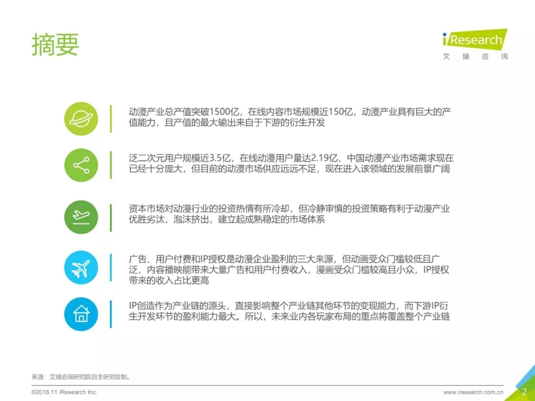 ? 《中國動漫行業報告》基于艾瑞多年對動漫行業的研究、數據積累以及艾瑞數據產品監測成果,通過對國內動漫產業的發展現狀和用戶需求的分析,結合動漫產業的自身特性,切實反映中國動漫行業的未來發展方向和趨勢。希望能為相關企業與資本市場提供參考意見與運營建議。