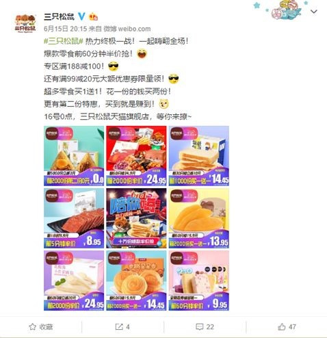 人們花勞動獲得的收入節儉,花意外之財鋪張,適時地給顧客一些好處,就能引發顧客的復購或搶購。所以三只松鼠經常在微博、公眾號搞福利放送。