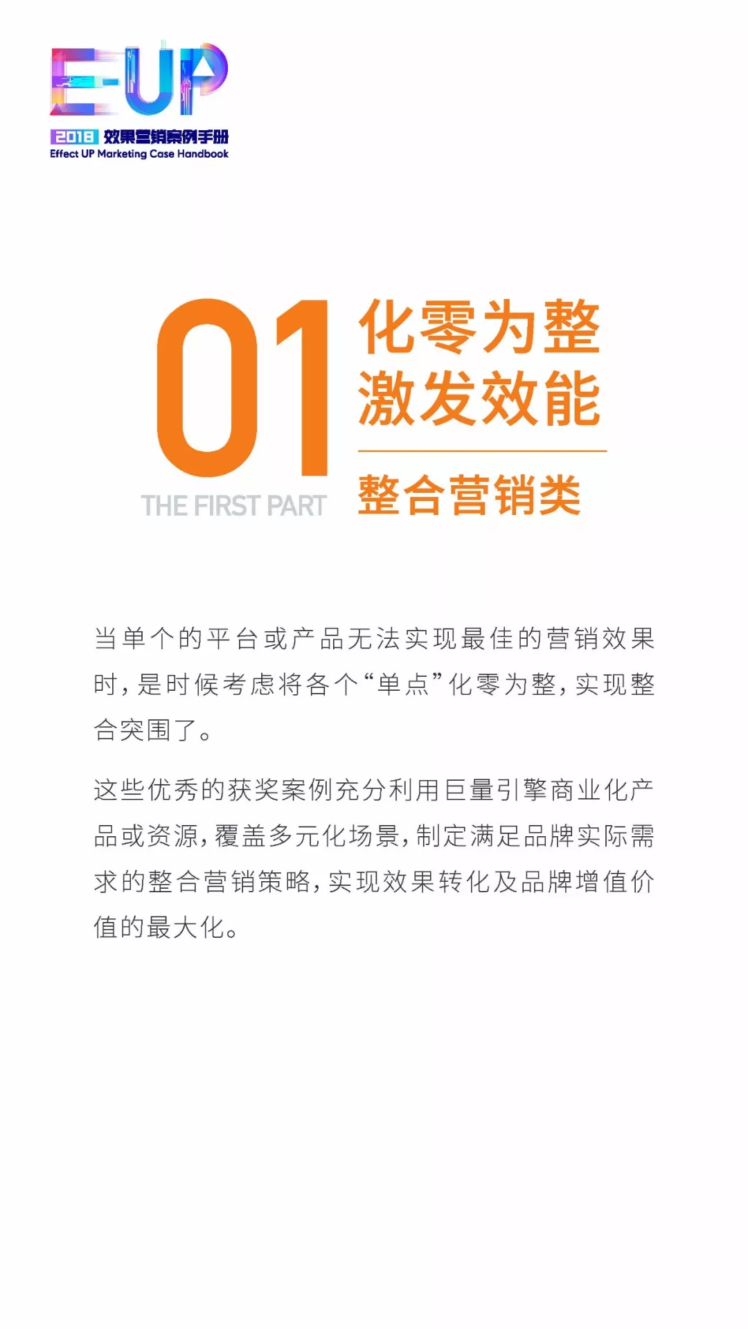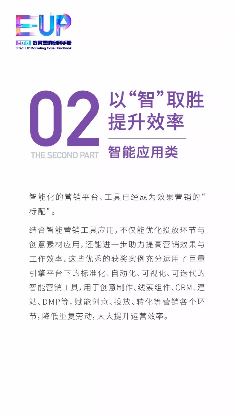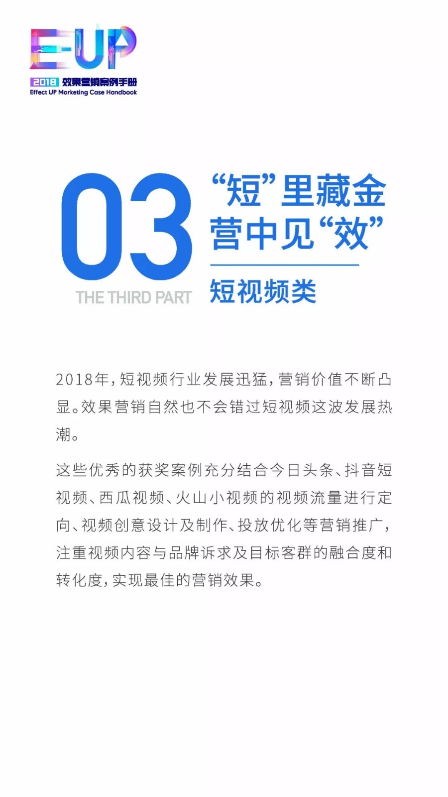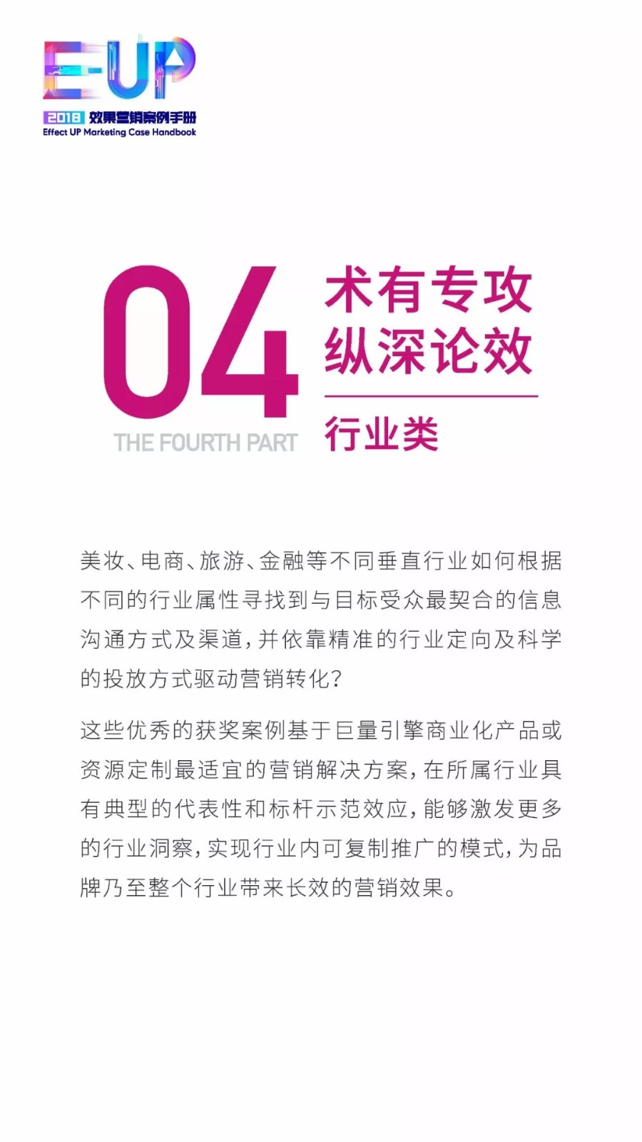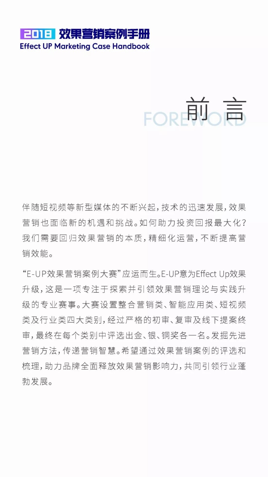 2019年1月28日,今日頭條聯合金鼠標數字營銷大賽共同發布了《2018效果營銷案例手冊》,對“2018E-UP效果營銷案例大賽”獲獎案例進行了全面系統的梳理,精細化呈現不同營銷代理公司及廣告主為實現品牌投資回報有效增長,從人群洞察、策略制定、智能投放,到效果評估貫穿效果營銷全鏈路的創新實踐與探索。