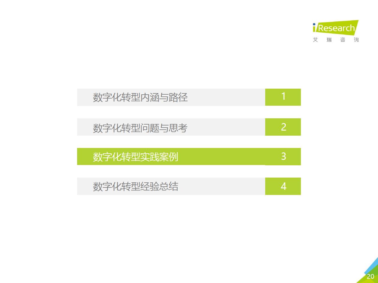 企業數字化轉型的推薦路徑:數字化轉型進入全面落地階段,越來越多的中小企業、地方企業和傳統企業都開始參與進來。對這部分企業來說,著手實施數字化轉型的時候往往存在著!下預算有限,內部信心不足等顧慮,先前以互聯網企業為代表的全面轉型路徑對它們并不適用。艾瑞認為企業可以采取“總體規劃、局部先行”的策略,從某些環節/部門開始,充分建立內部信心,再逐步推廣到全企業(以’‘數字化營銷”數字化采購”數字化管理”為典型路徑)。企業首先進行自我洞察,確定核心需求和評判指標,以需求驅動數字化轉型落地,從而提升轉型的成功率。
