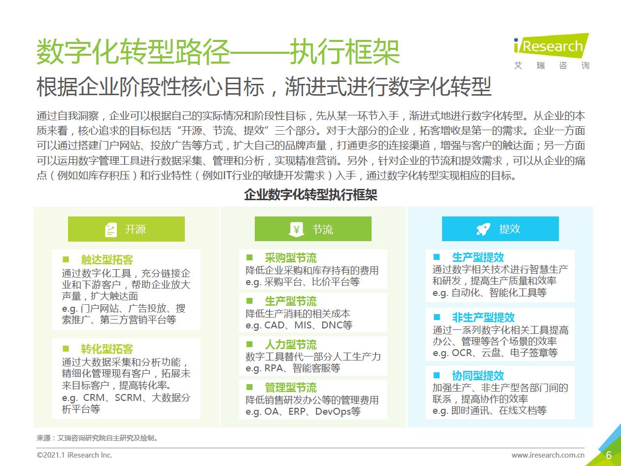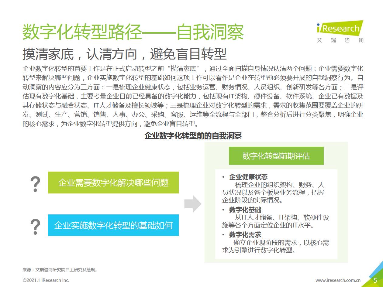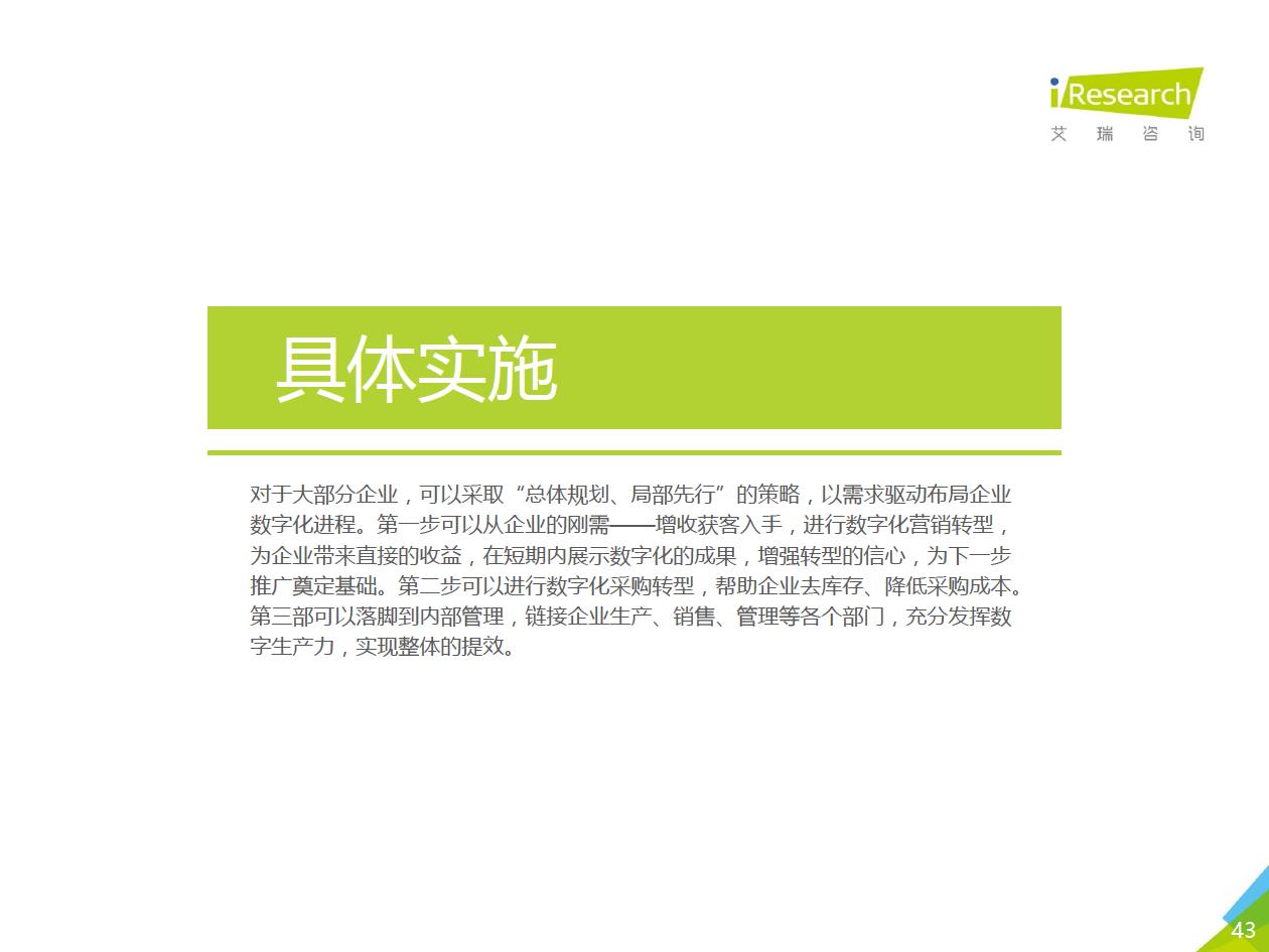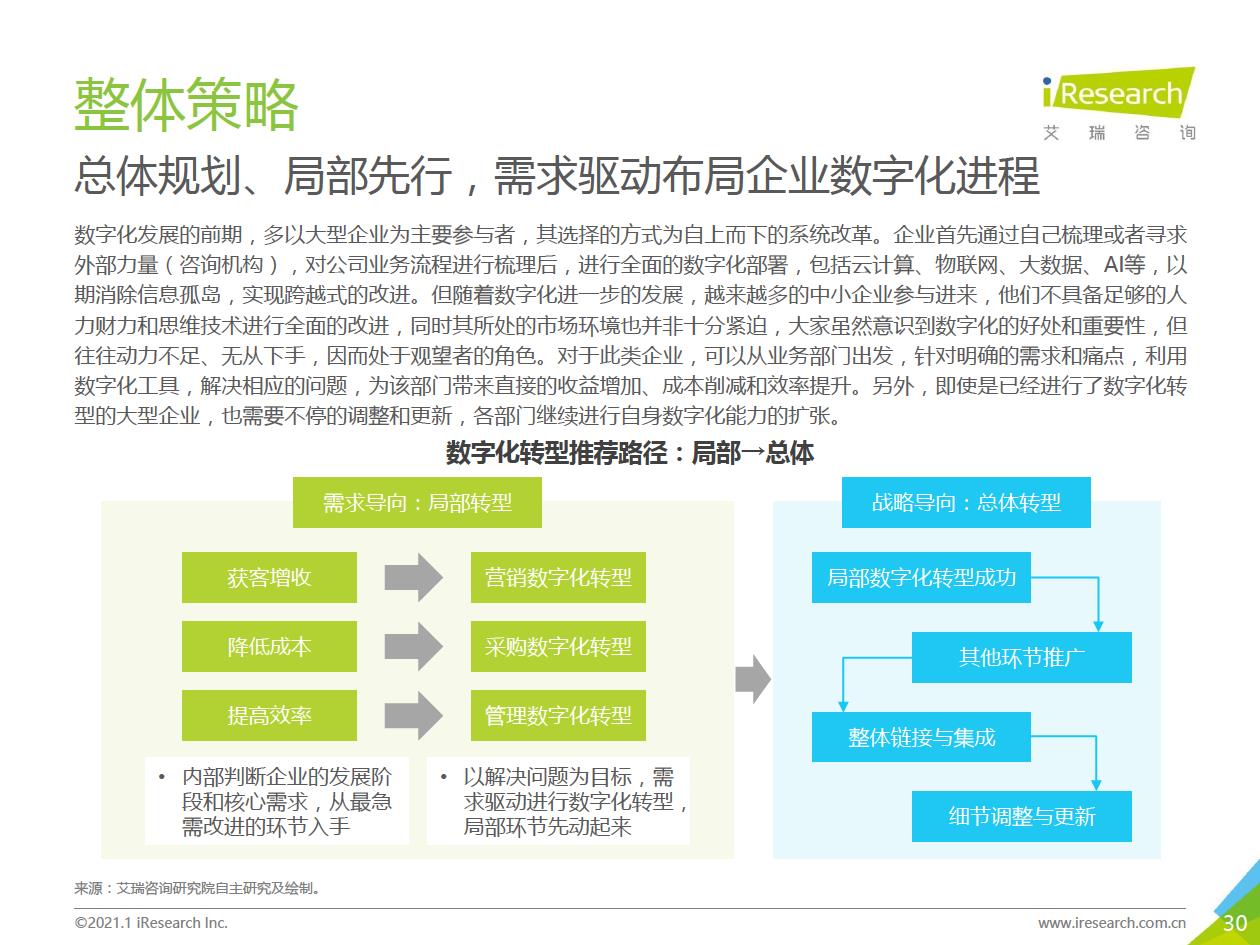 企業數字化轉型的推薦路徑:數字化轉型進入全面落地階段,越來越多的中小企業、地方企業和傳統企業都開始參與進來。對這部分企業來說,著手實施數字化轉型的時候往往存在著!下預算有限,內部信心不足等顧慮,先前以互聯網企業為代表的全面轉型路徑對它們并不適用。艾瑞認為企業可以采取“總體規劃、局部先行”的策略,從某些環節/部門開始,充分建立內部信心,再逐步推廣到全企業(以’‘數字化營銷”數字化采購”數字化管理”為典型路徑)。企業首先進行自我洞察,確定核心需求和評判指標,以需求驅動數字化轉型落地,從而提升轉型的成功率。