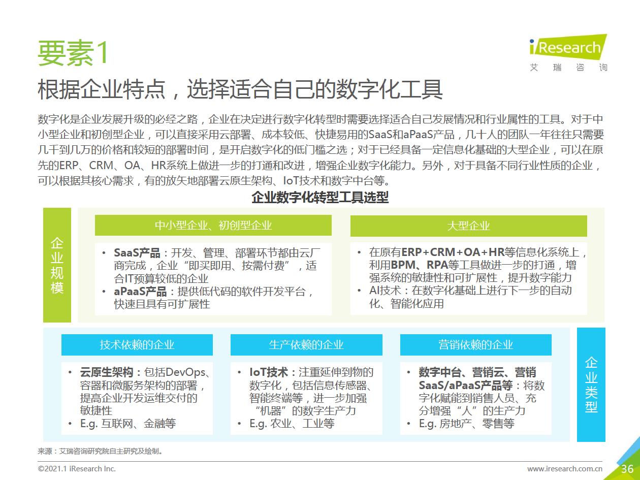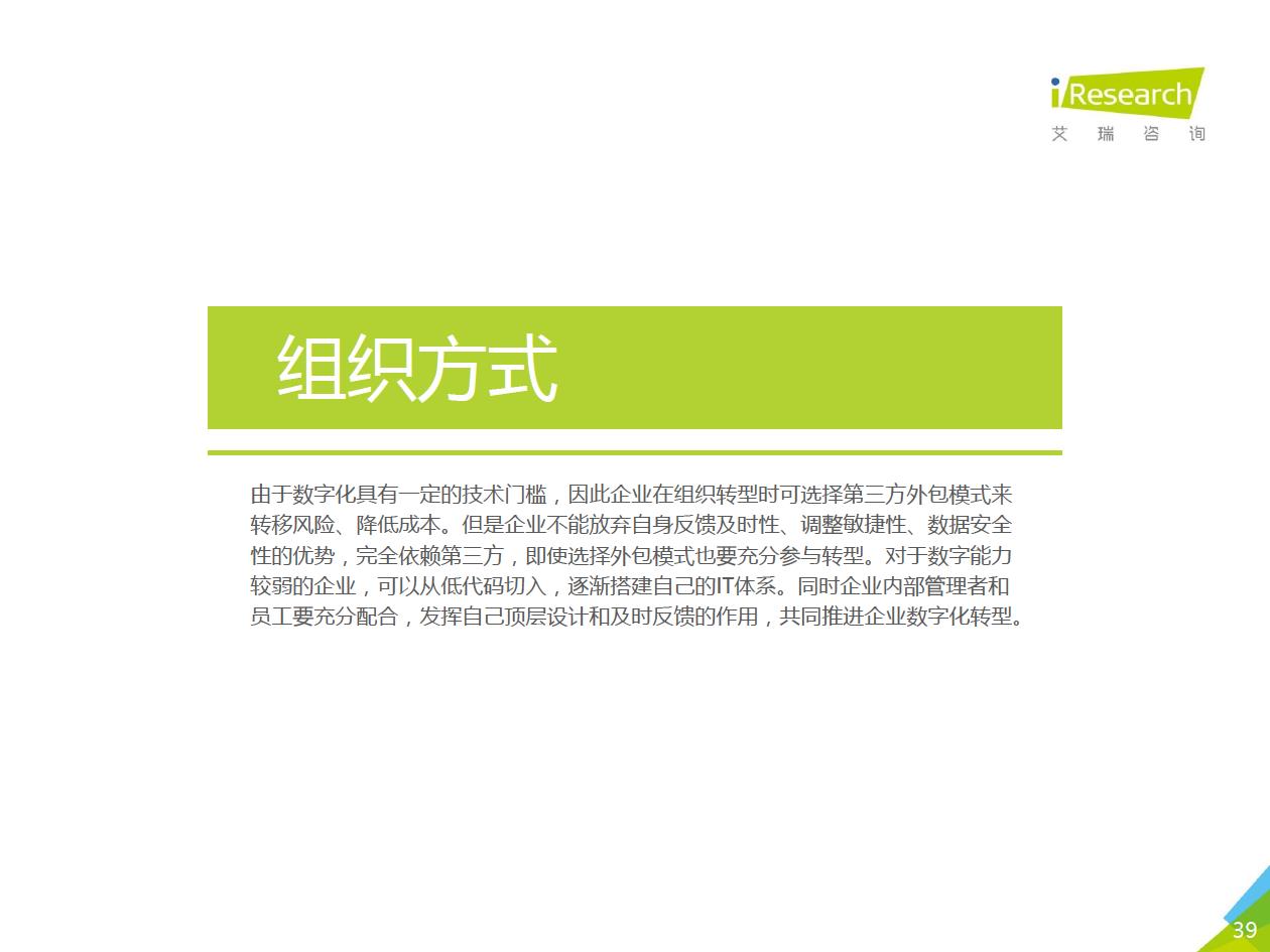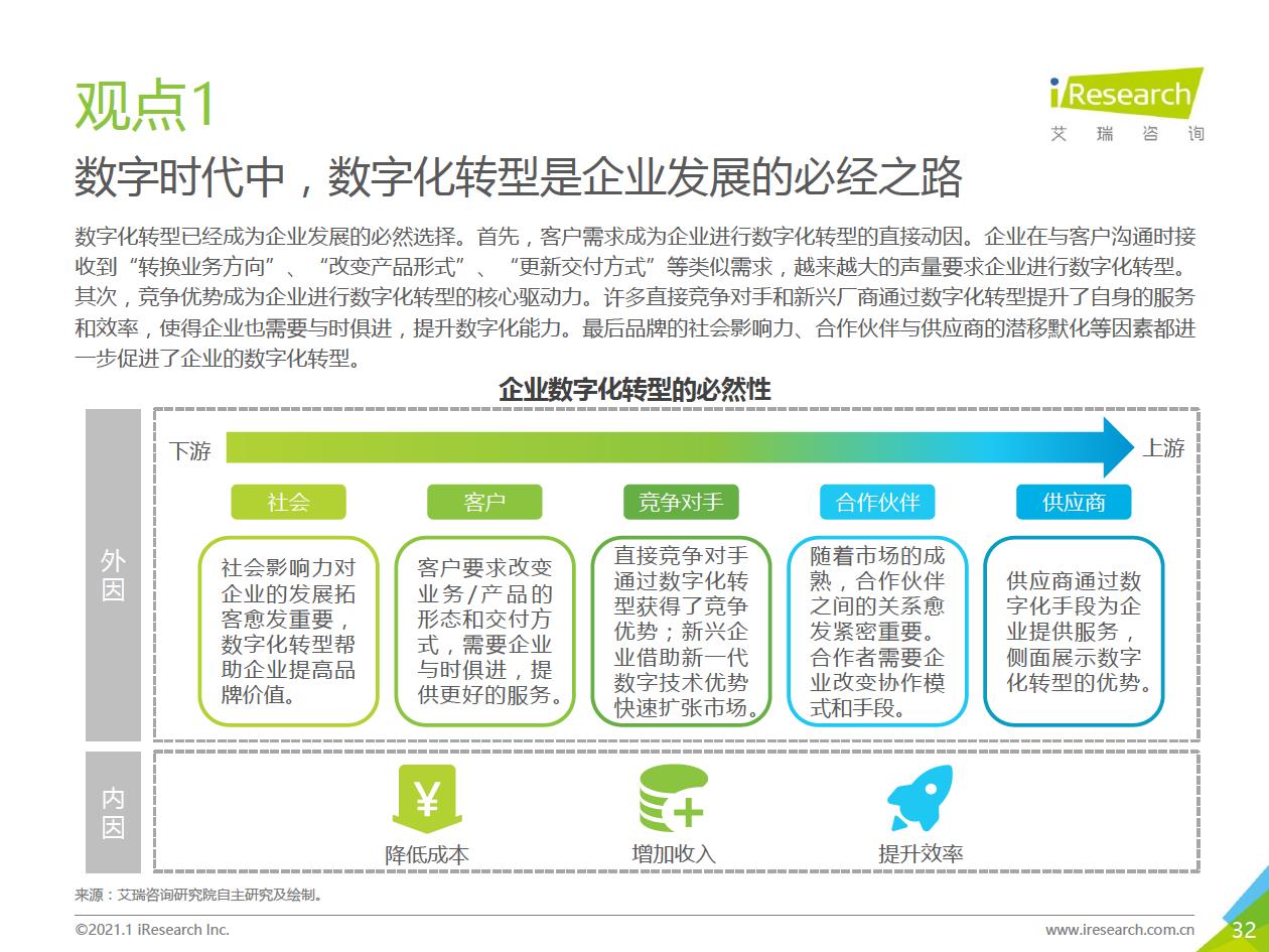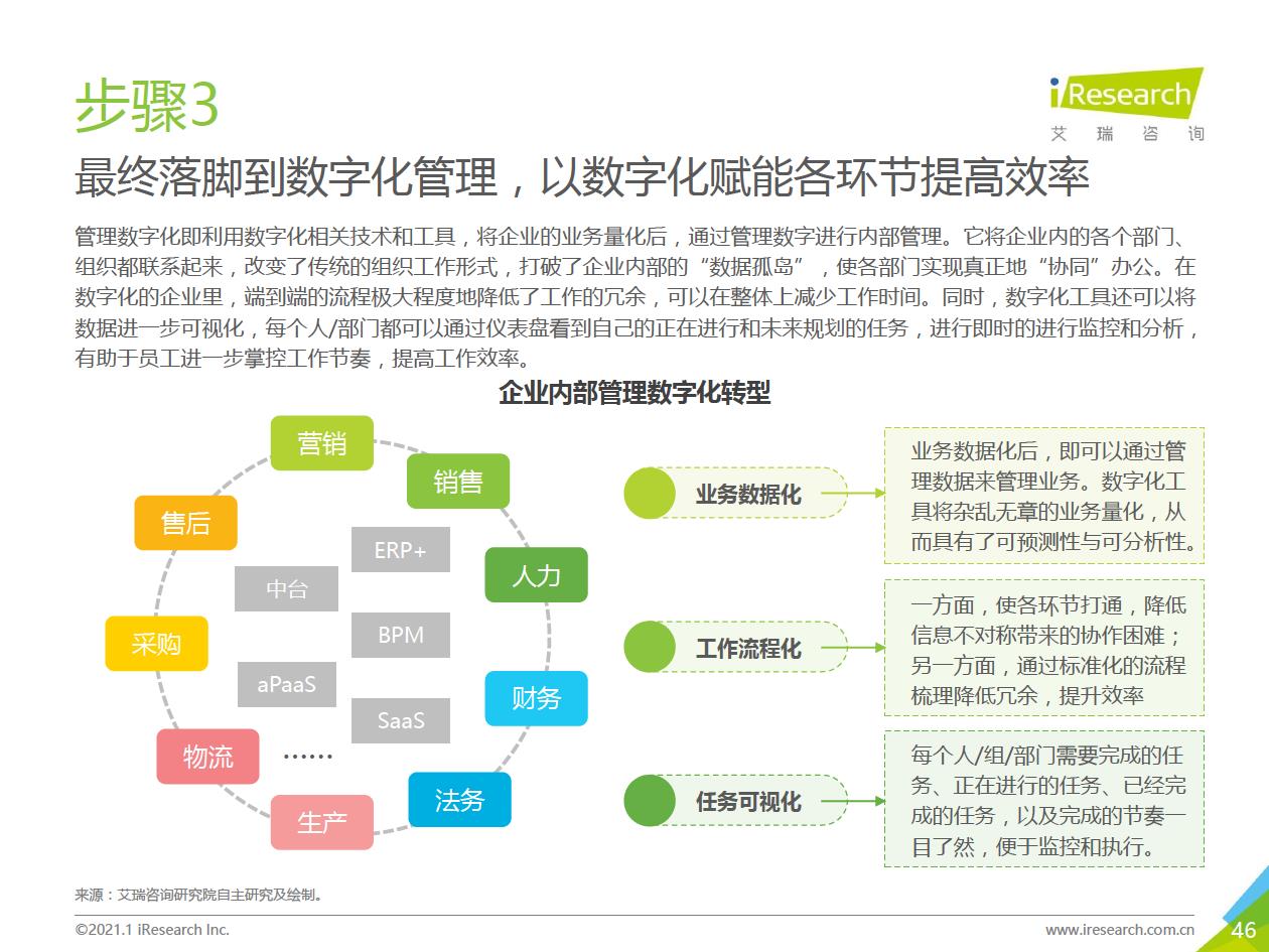 企業數字化轉型的推薦路徑:數字化轉型進入全面落地階段,越來越多的中小企業、地方企業和傳統企業都開始參與進來。對這部分企業來說,著手實施數字化轉型的時候往往存在著!下預算有限,內部信心不足等顧慮,先前以互聯網企業為代表的全面轉型路徑對它們并不適用。艾瑞認為企業可以采取“總體規劃、局部先行”的策略,從某些環節/部門開始,充分建立內部信心,再逐步推廣到全企業(以’‘數字化營銷”數字化采購”數字化管理”為典型路徑)。企業首先進行自我洞察,確定核心需求和評判指標,以需求驅動數字化轉型落地,從而提升轉型的成功率。