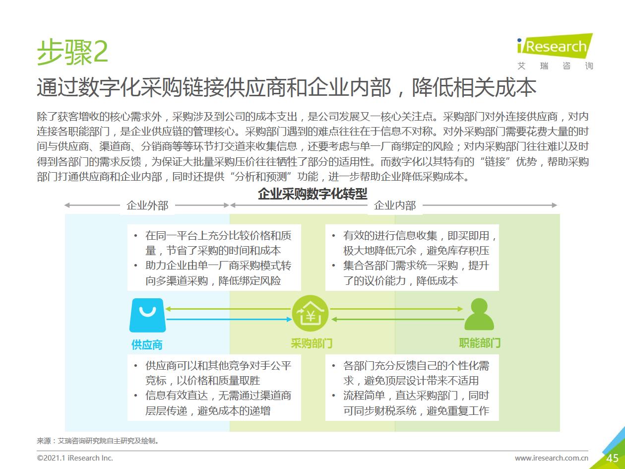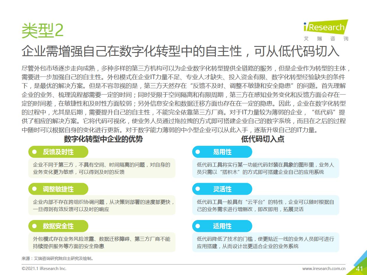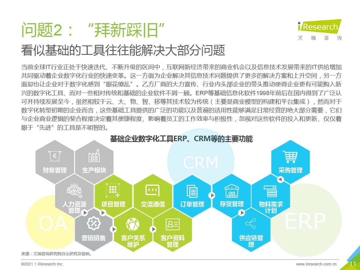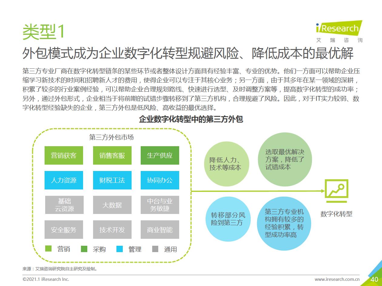 企業數字化轉型的推薦路徑:數字化轉型進入全面落地階段,越來越多的中小企業、地方企業和傳統企業都開始參與進來。對這部分企業來說,著手實施數字化轉型的時候往往存在著!下預算有限,內部信心不足等顧慮,先前以互聯網企業為代表的全面轉型路徑對它們并不適用。艾瑞認為企業可以采取“總體規劃、局部先行”的策略,從某些環節/部門開始,充分建立內部信心,再逐步推廣到全企業(以’‘數字化營銷”數字化采購”數字化管理”為典型路徑)。企業首先進行自我洞察,確定核心需求和評判指標,以需求驅動數字化轉型落地,從而提升轉型的成功率。