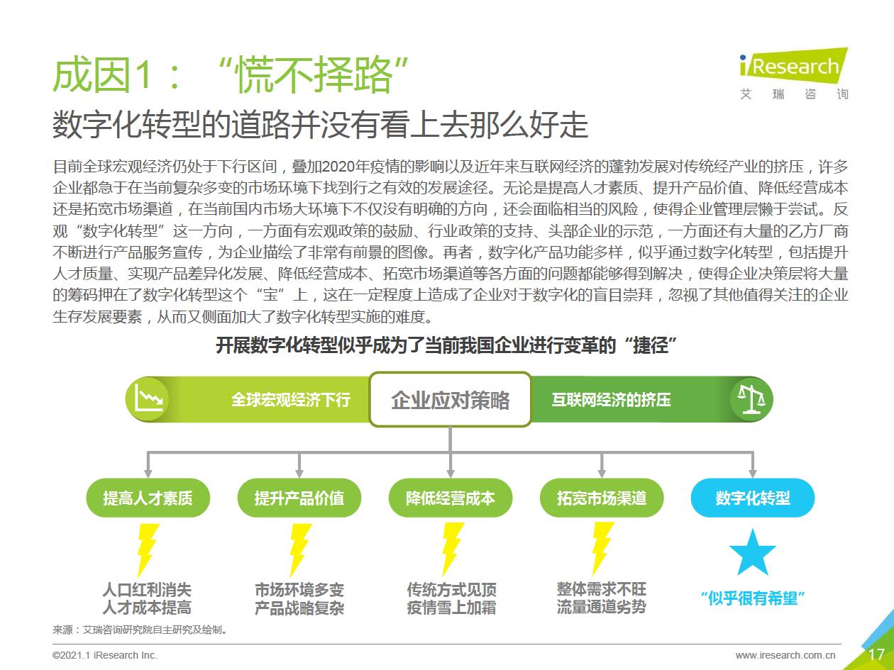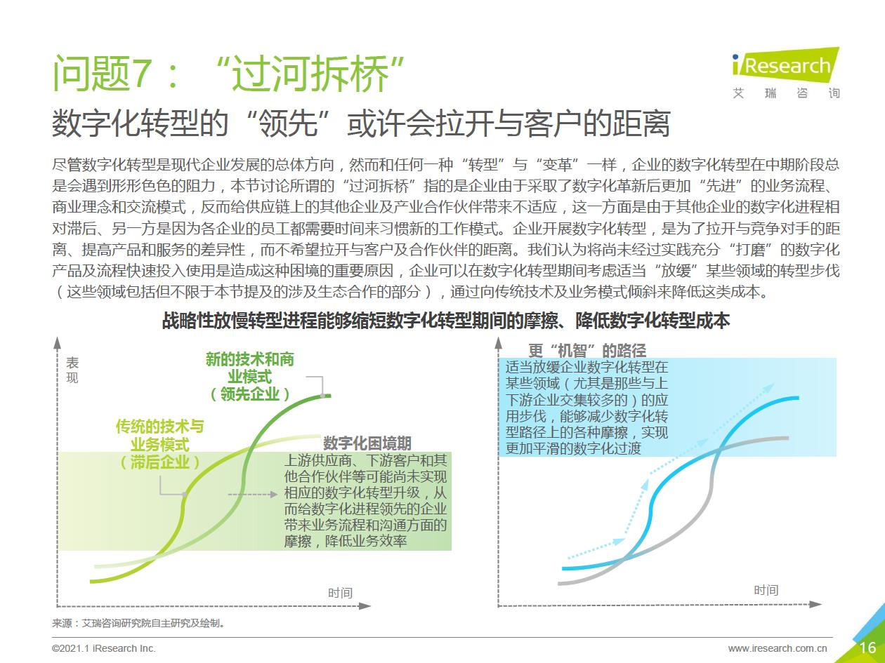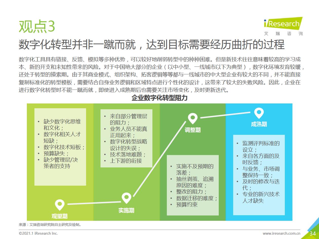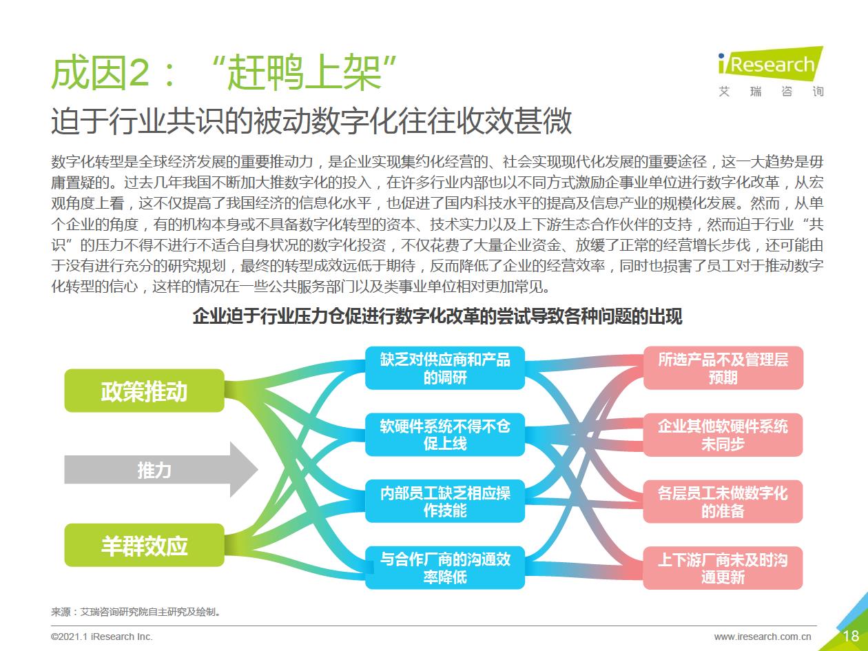 企業數字化轉型集中問題:艾瑞通過實地調研發現,在數字化轉型實踐中,企業從前期投入階段到中期內化階段,到后期輸出階段,都存在著各種各樣的問題.總結來看,中國企業現階段數字化轉型失敗的問題主要集中在兩個方面:一部分只注重成果,希望數字化轉型一站式地解決企業所有矛盾,卻將前期自我洞察、產品選型、實施規劃等環節“簡單化”;另一部分則將數字化轉型想象得過于‘’復雜化‘ ' ,因而遲遲不愿意嘗試和行勸。