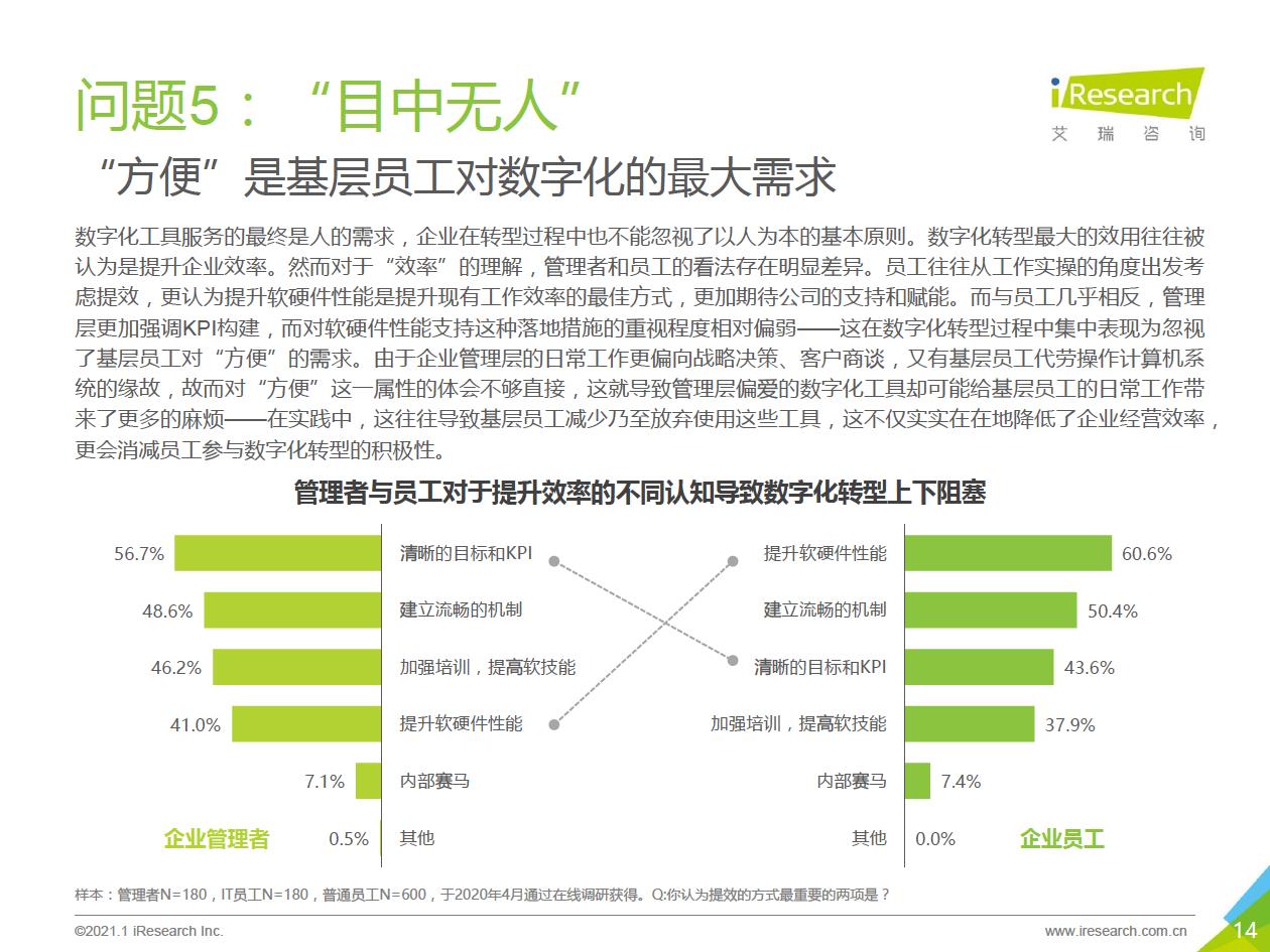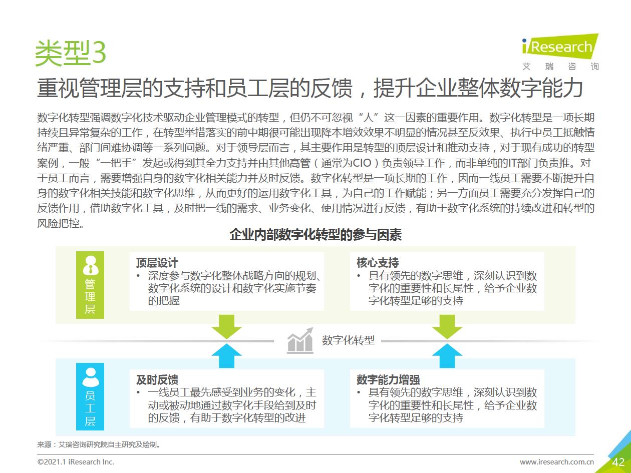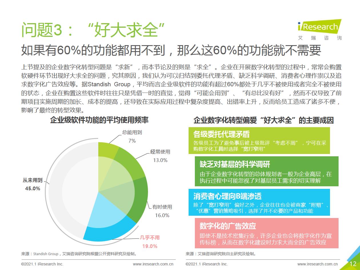 企業數字化轉型集中問題:艾瑞通過實地調研發現,在數字化轉型實踐中,企業從前期投入階段到中期內化階段,到后期輸出階段,都存在著各種各樣的問題.總結來看,中國企業現階段數字化轉型失敗的問題主要集中在兩個方面:一部分只注重成果,希望數字化轉型一站式地解決企業所有矛盾,卻將前期自我洞察、產品選型、實施規劃等環節“簡單化”;另一部分則將數字化轉型想象得過于‘’復雜化‘ ' ,因而遲遲不愿意嘗試和行勸。