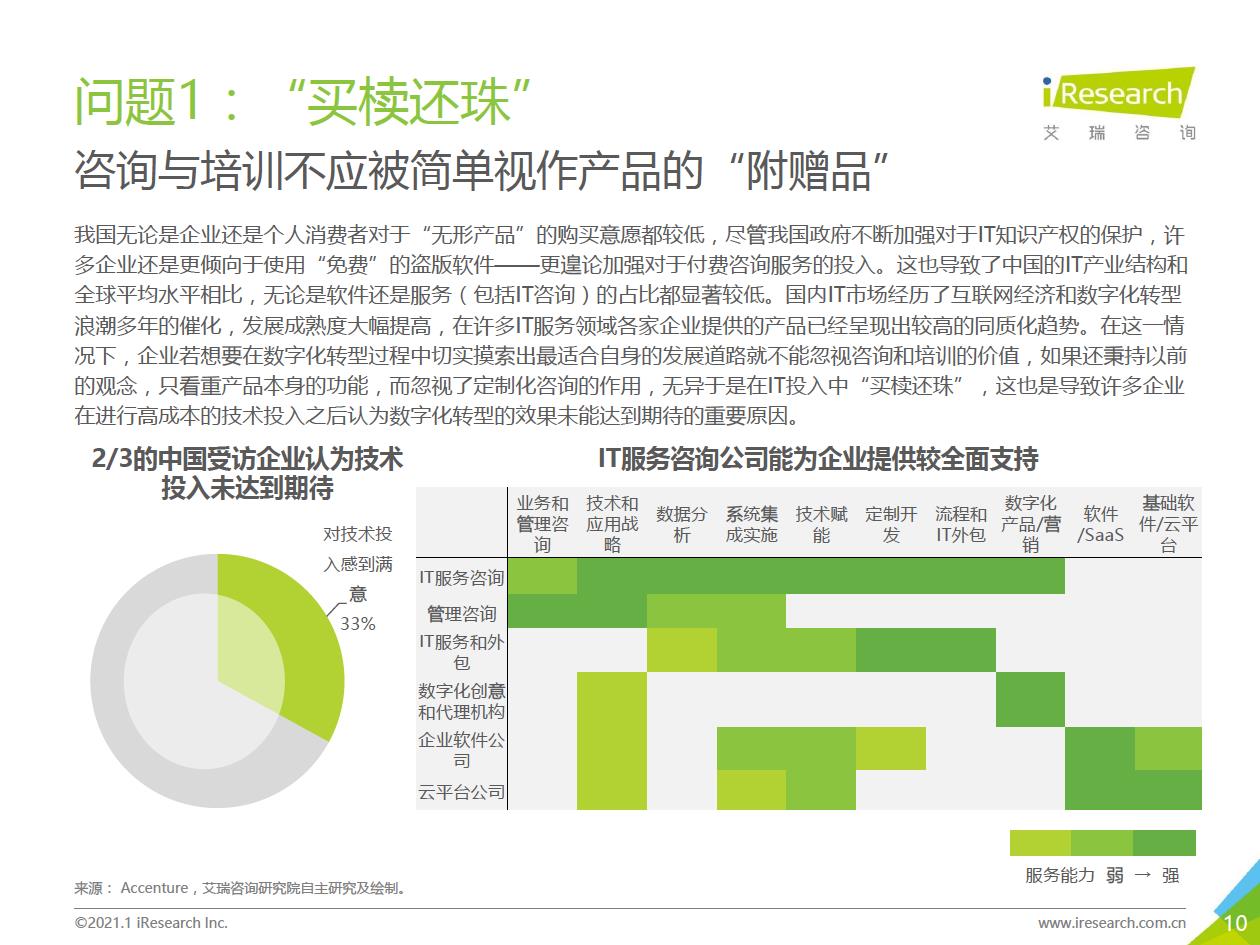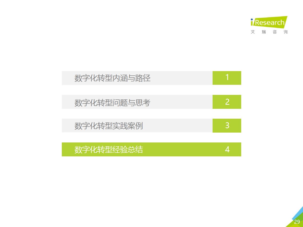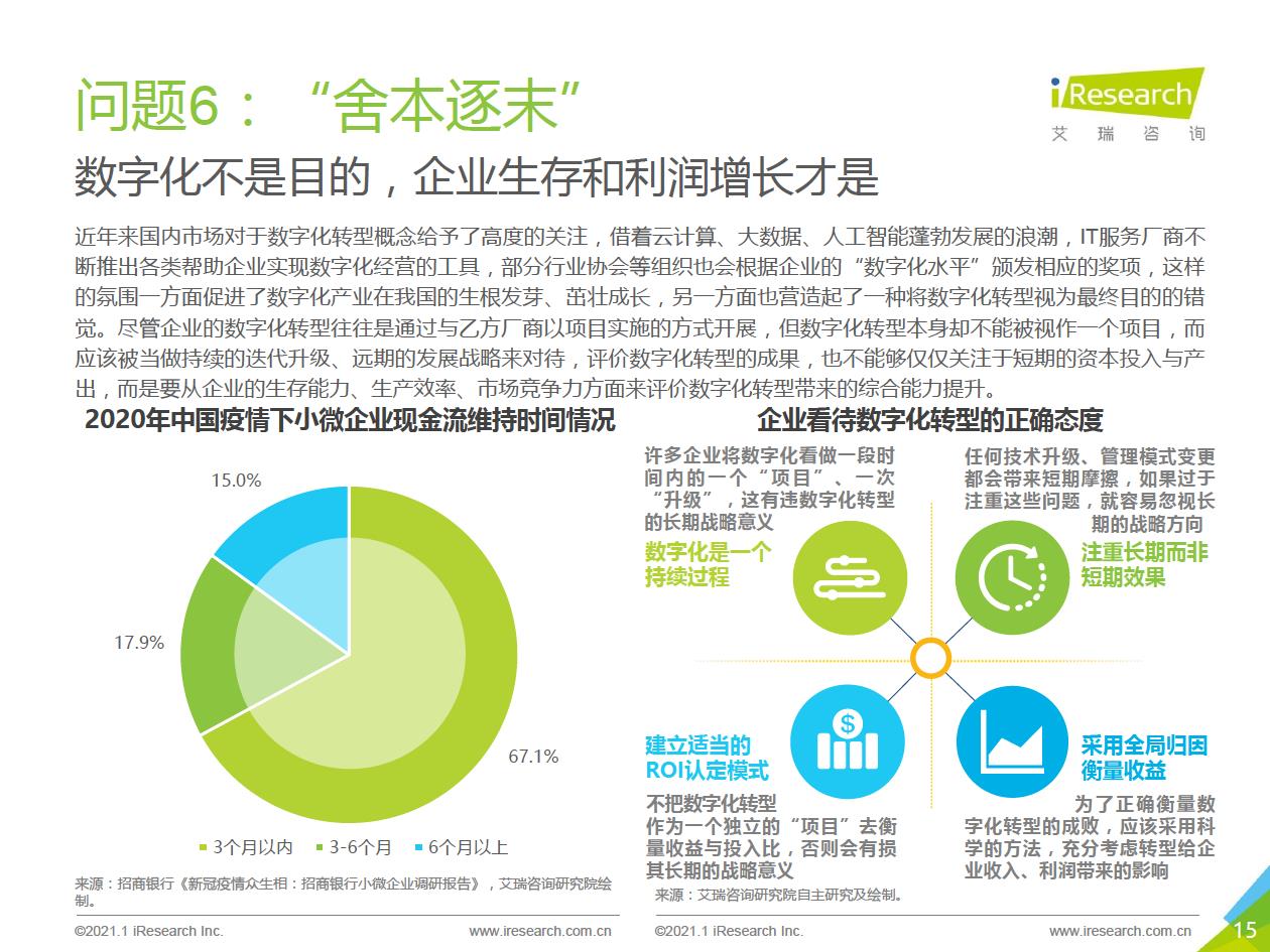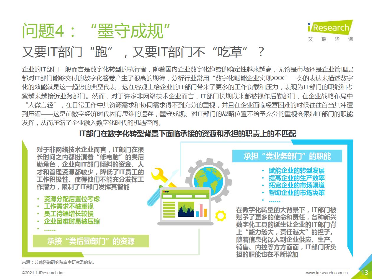 企業數字化轉型集中問題:艾瑞通過實地調研發現,在數字化轉型實踐中,企業從前期投入階段到中期內化階段,到后期輸出階段,都存在著各種各樣的問題.總結來看,中國企業現階段數字化轉型失敗的問題主要集中在兩個方面:一部分只注重成果,希望數字化轉型一站式地解決企業所有矛盾,卻將前期自我洞察、產品選型、實施規劃等環節“簡單化”;另一部分則將數字化轉型想象得過于‘’復雜化‘ ' ,因而遲遲不愿意嘗試和行勸。