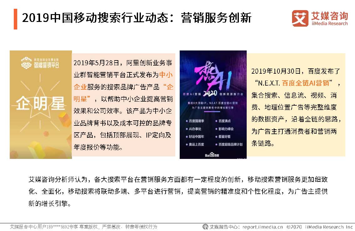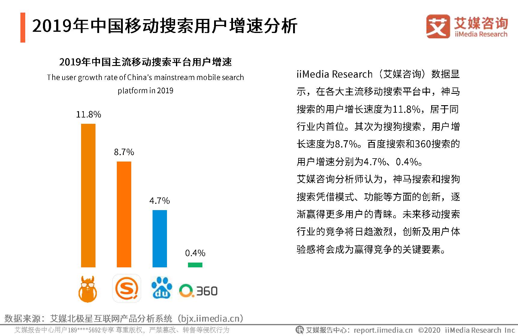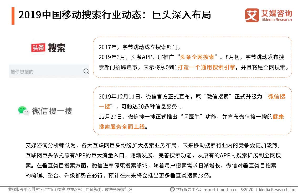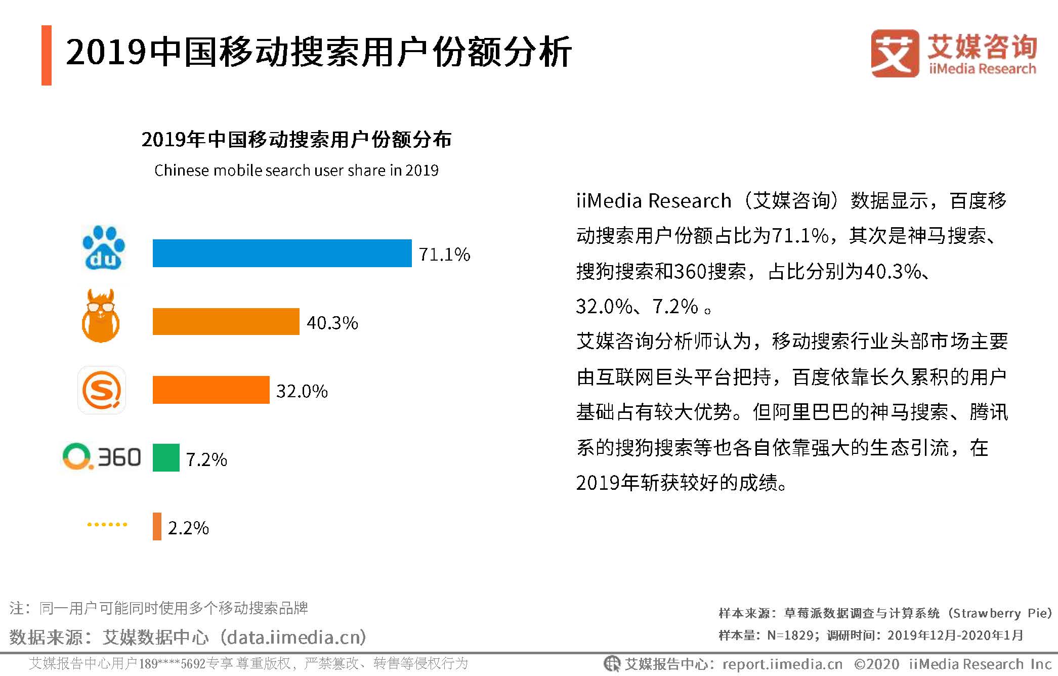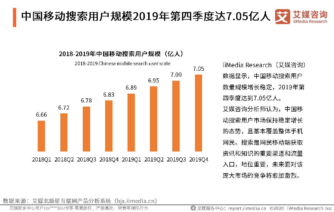 移動搜索用戶達7.05億人,2020將迎激烈競爭年。2019年第四季度中國移動搜索用戶已達7.05億人,規模保持穩定增長態勢。與此同時,各大互聯網巨頭平臺更加注重在搜索行業的布局,而神馬搜索、搜狗搜索等平臺也繼續加強發展步伐,面對龐大的市場,2020年移動搜索將迎來激烈競爭年。